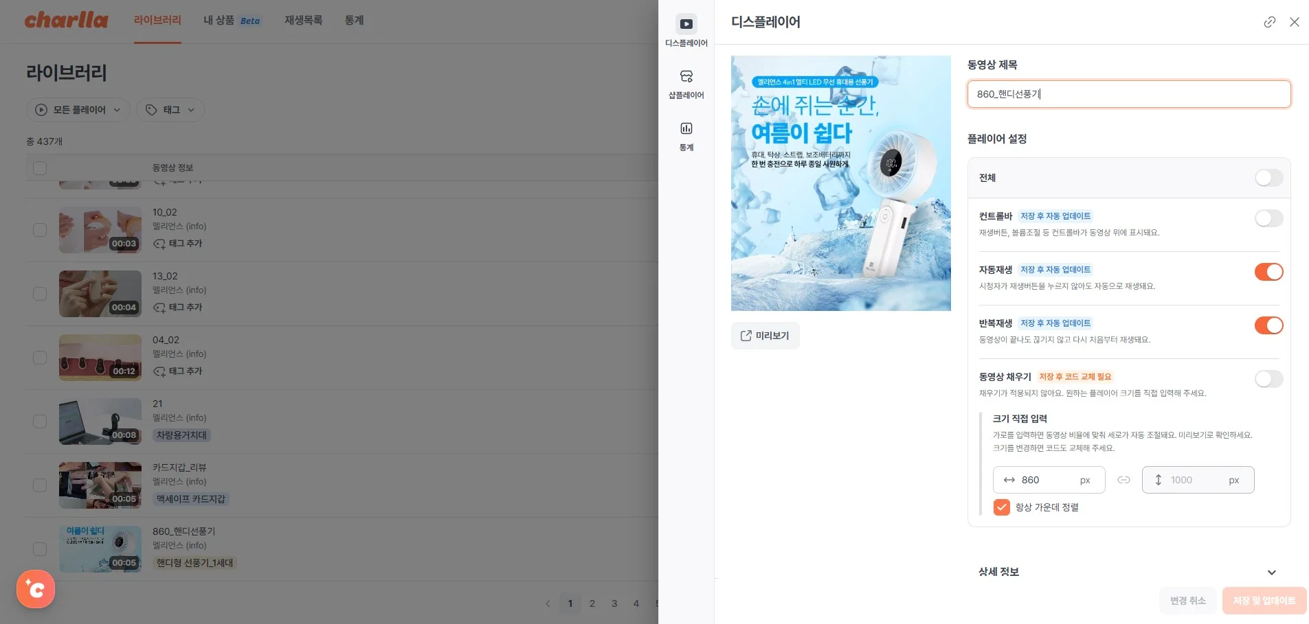 마지막으로, 상세페이지에서 영상이 바로 재생된다는 점도 큰 장점입니다. 고객이 스크롤을 내리는 순간 자동으로 영상이 재생되어 빠르게 몰입감을 줄 수 있어요. 자동 재생뿐만 아니라 반복 재생까지 간단하게 버튼으로 ON/OFF가 가능하여 상황에 맞게 유연하게 활용할 수 있어서 아주 편리합니다.