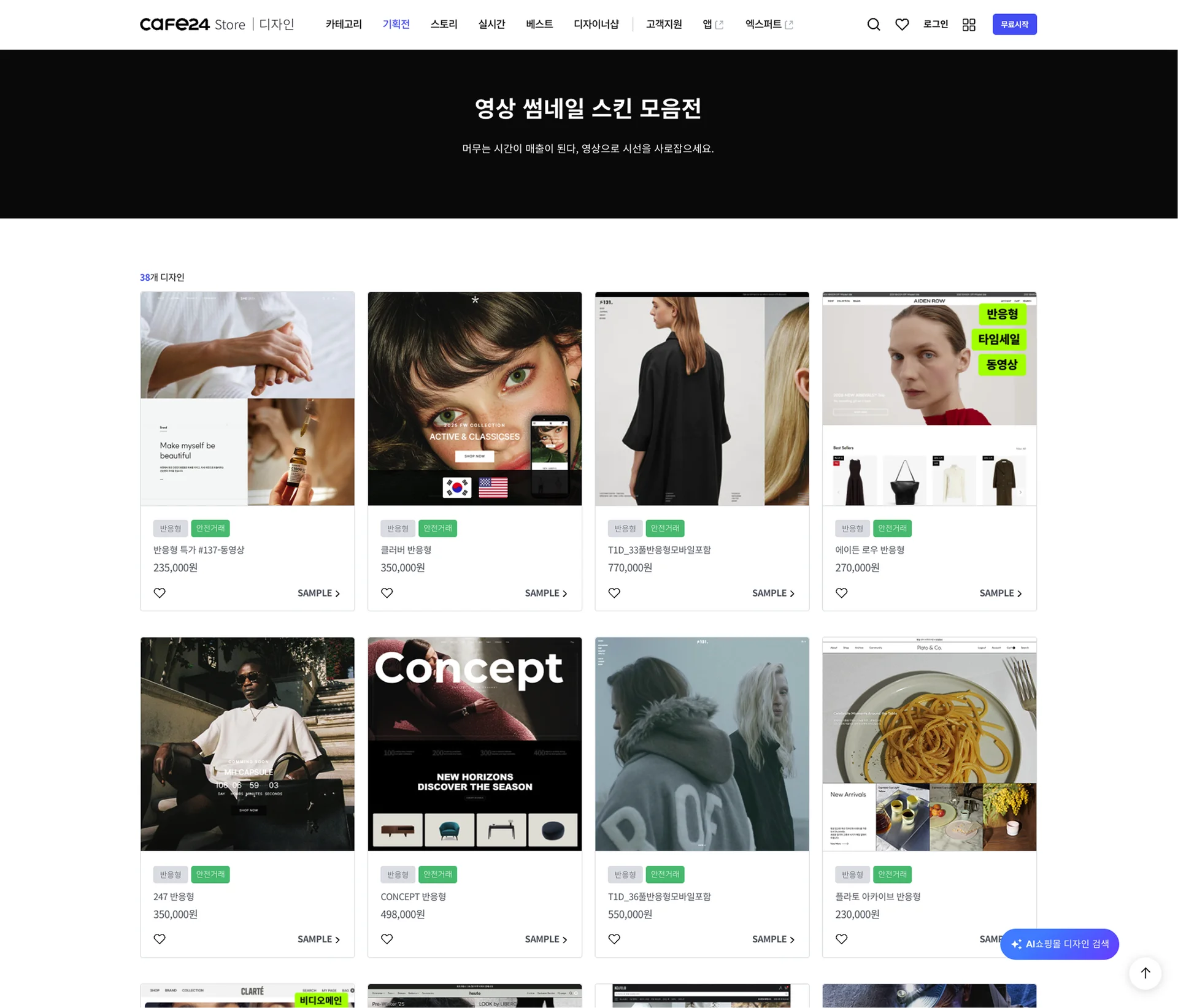 이러한 흐름에 맞춰 카페24도 영상 중심의 쇼핑몰 템플릿을 적극적으로 선보이고 있어요. 그 대표적인 사례가 바로 ‘영상 썸네일 스킨 모음전’인데요. 이 기획전에서는 영상 UI가 적용된 다양한 쇼핑몰 템플릿을 한눈에 살펴볼 수 있어요. 상품 리스트부터 메인 영역, 상세페이지까지 영상이 실제로 쇼핑 흐름 안에서 어떻게 활용되는지를 직접 확인할 수 있어서, 템플릿 선택을 고민하는 브랜드라면 참고하기 좋은 기획전이에요.